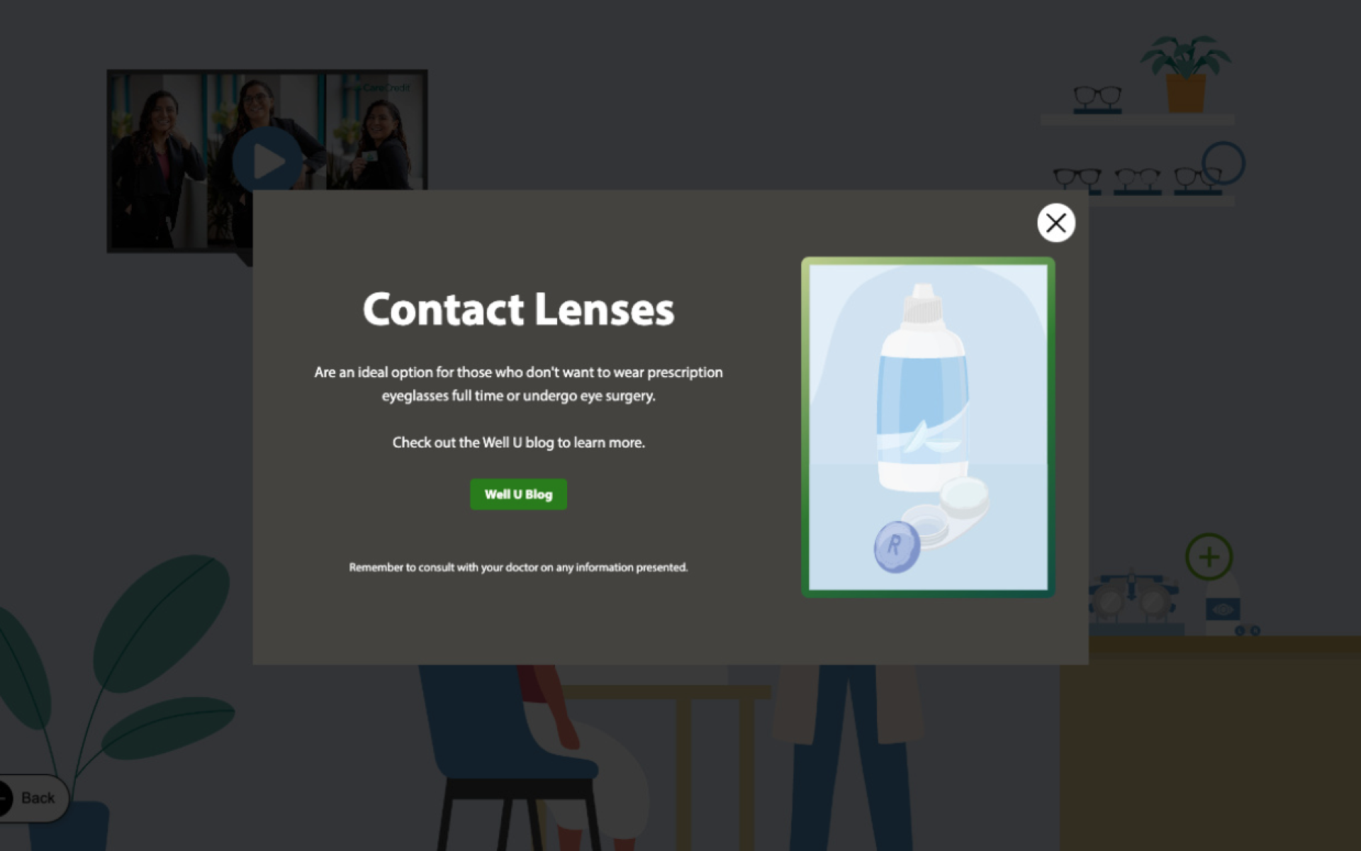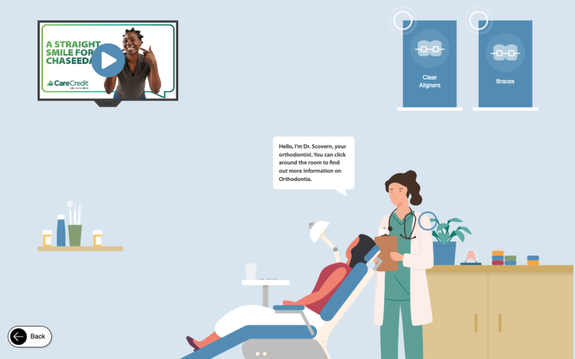 Collaboration with Design by Soap: Final Version collaborated with Design by Soap, known for their expertise in creating interactive and illustrative designs, to develop an animated and interactive world representing Care Credit's various services. A virtual street scene was designed, featuring shops and buildings which each represented a specific healthcare service. This lively street scene included characters and animation to make the experience relatable and engaging.